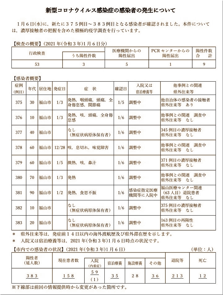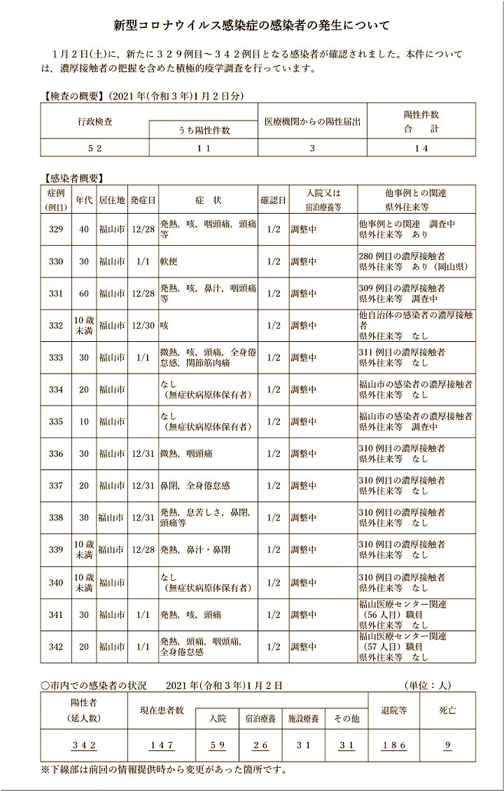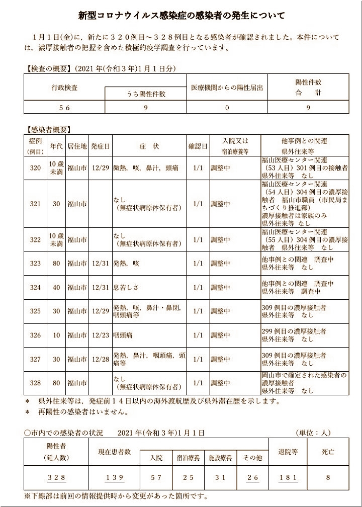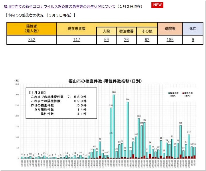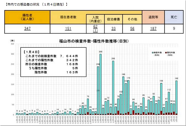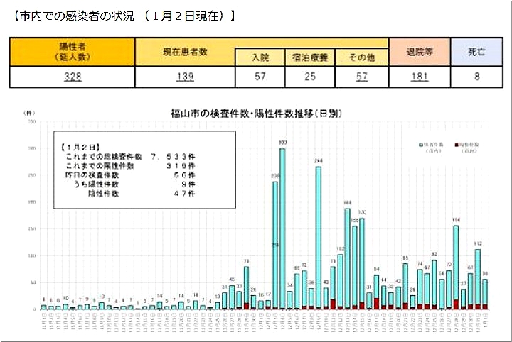 福山市の発表によりますと、正月2日目の本日は、9名の新たなコロナ感染者が確認されましたとの事。
