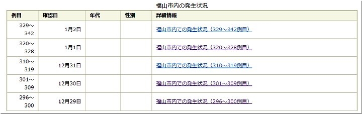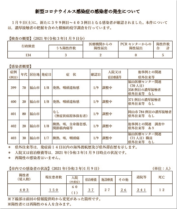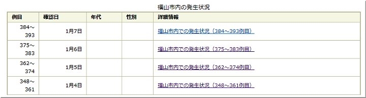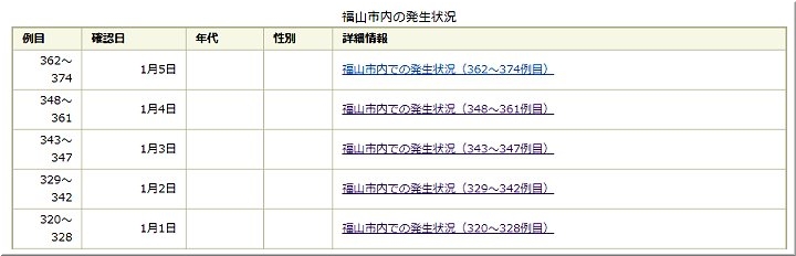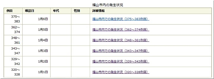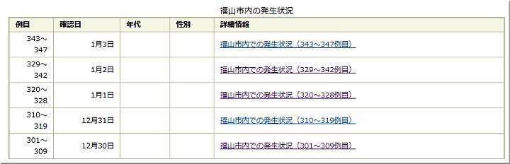 福山市及び中国新聞sanの発表によりますと、昨日(1/9)・今日(1/10)と各5名、福山市で計10名のコロナ感染者が確認されましたようです。