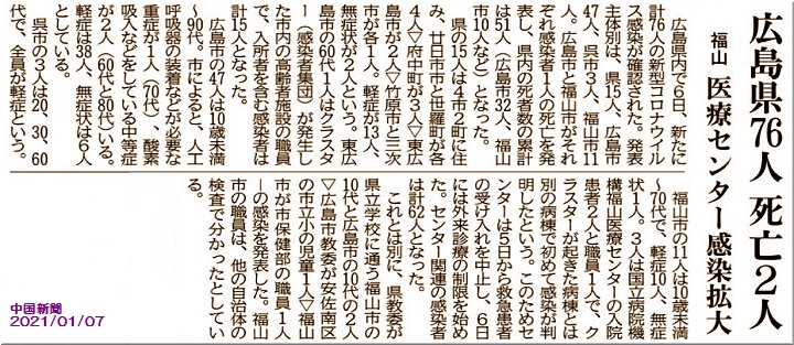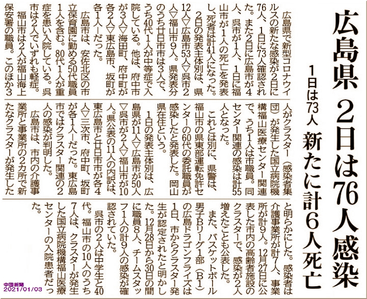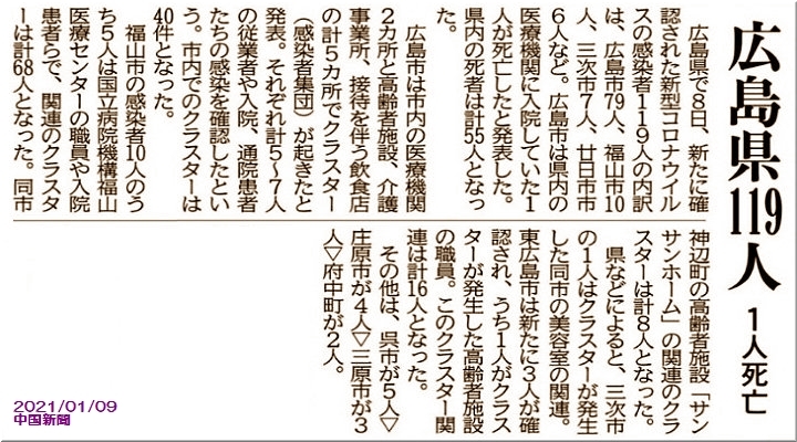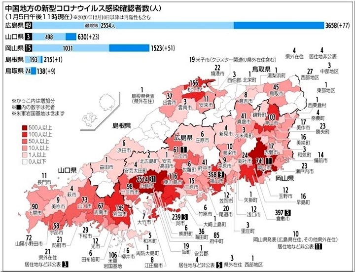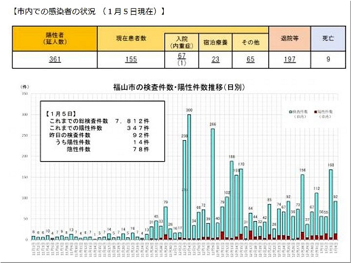 昨日の福山市の発表、そして本日の中国新聞sanの朝刊記事によりますと、福山市では、結局、1/5(火)の新たなコロナ感染者は13名のようですネ。