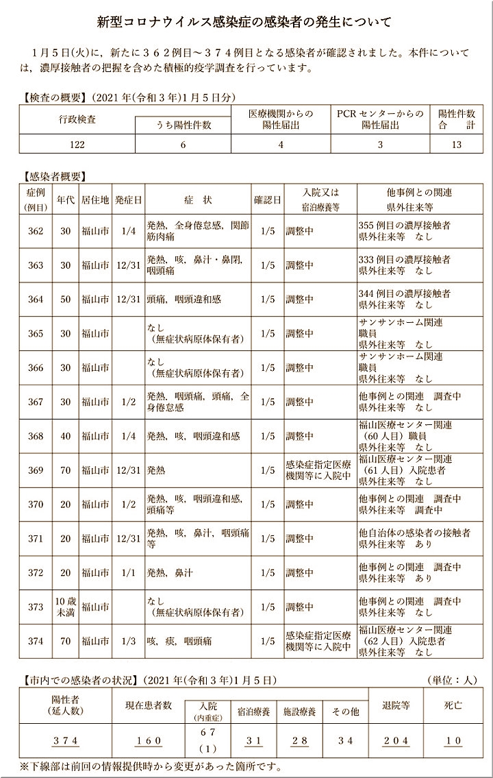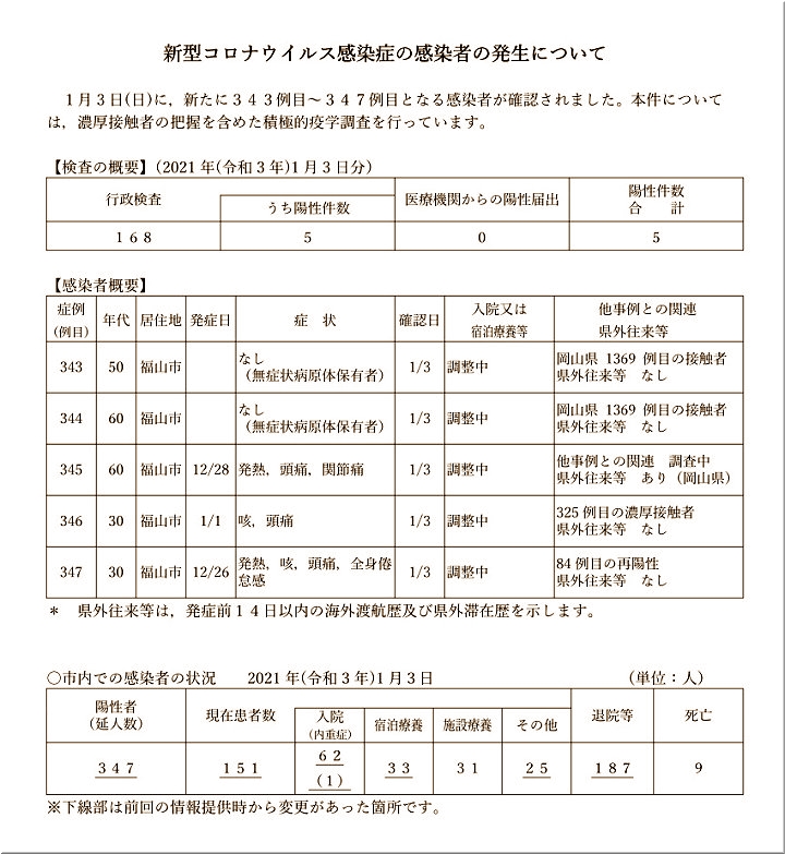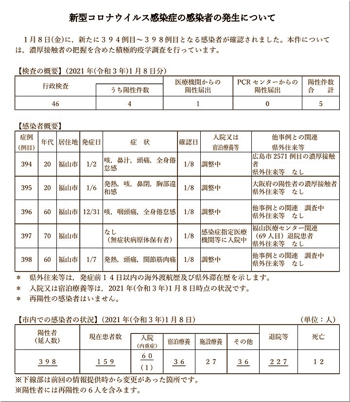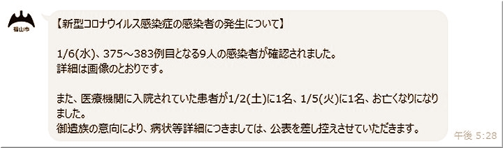 正月三が日明けの今日は、福山市で5名の感染者が確認です…