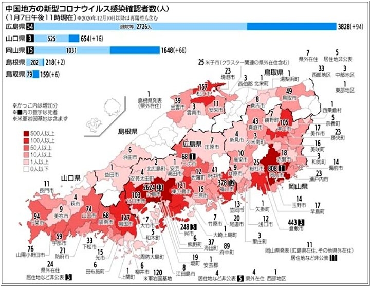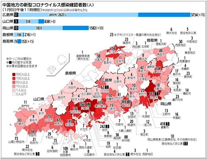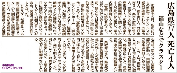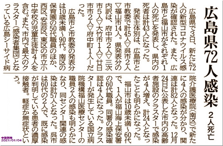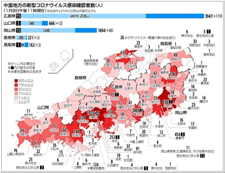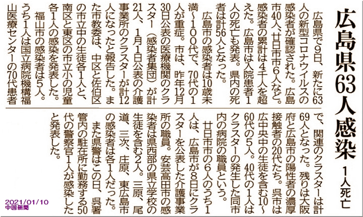 広島市の感染者は10歳未満〜100代で、70代の1人が重症。市は、昨年12月30日公表の医療機関のクラスター(感染者集団)が計21人、1月1日公表の介護事業所のクラスターが計12人になったと報告した。また市教委は、中区と佐伯区の市立中の生徒各1人と、南区と東区の市立小の児童各1人の感染を発表した。