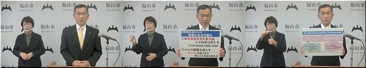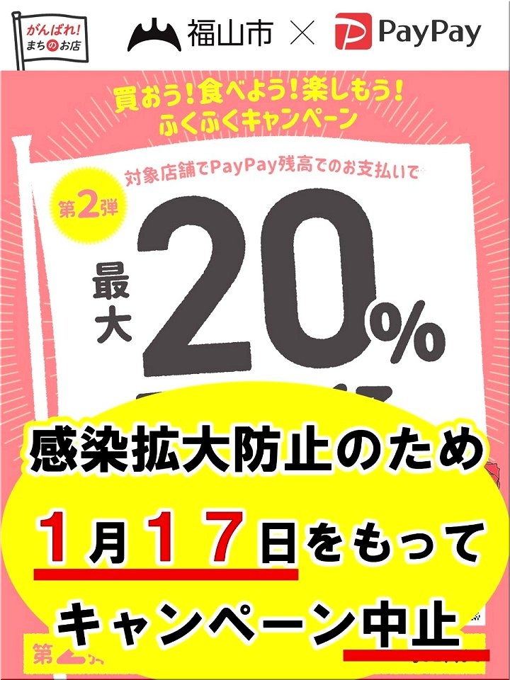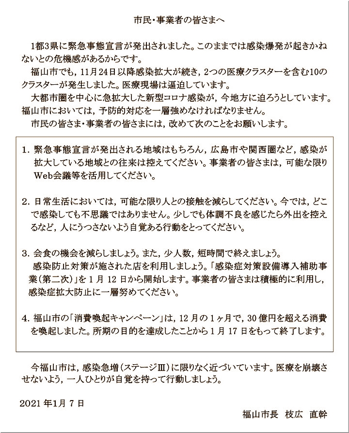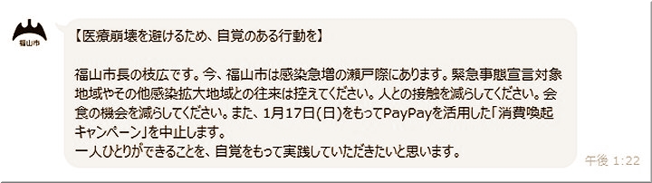 福山市長の枝広です。今、福山市は感染急増の瀬戸際にあります。緊急事態宣言対象地域やその他感染拡大地域との往来は控えてください。人との接触を減らしてください。会食の機会を減らしてください。また、1月17日(日)をもってPayPayを活用した「消費喚起キャンペーン」を中止します。