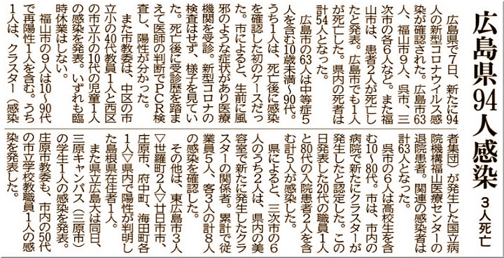 ◆広島県は94人感染、3人死亡 7日の新型コロナ