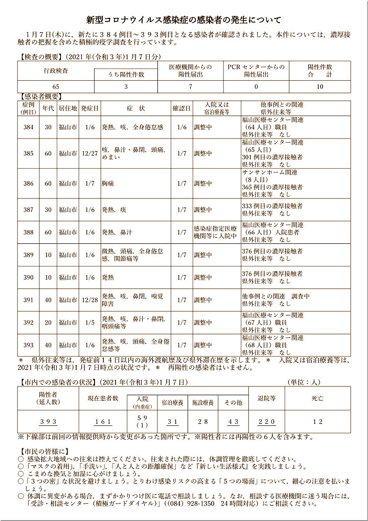 10名のうち5名が福山医療センターの関連ですから、これで同センターの発生者は68人目となりますネ。福山市としましては、393例目の感染者発生となりますようです。