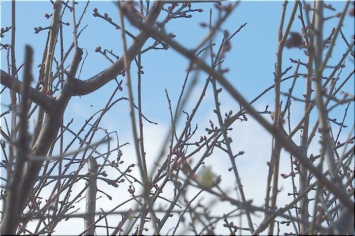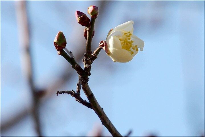 そして、まだ蕾状態だなぁ〜と暫く梅の木に眼を向けておりました。ら、よくよく見ますと、たった一つだけ開花です(^_^)v