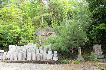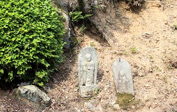 寒水寺へ向かうためにあったと伝わる旧参道(現在より西の湯野村小山池付近からの参道=消滅)の門跡には栴檀(せんだん)の古木があり、その樹下に地蔵2体を半浮彫りにした巨岩がありますが、さらに登ると仰ぎ見るように地蔵が彫られ、霊地に入る導きのようで、山岳寺院として四隣を圧していたことがうかがえます。
