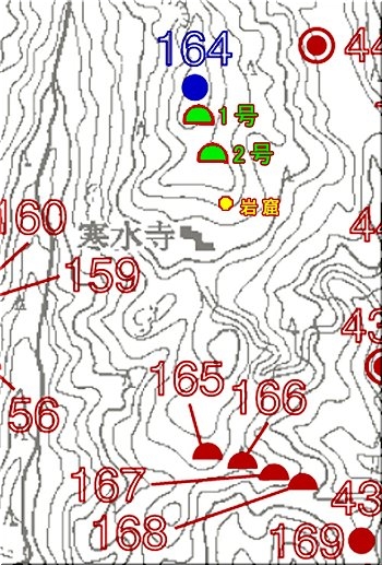 青164は寒水寺裏山遺跡の位置が間違って記載されたもので、黄●の位置が正しい。