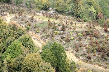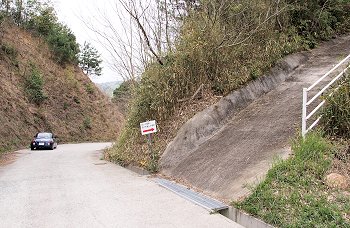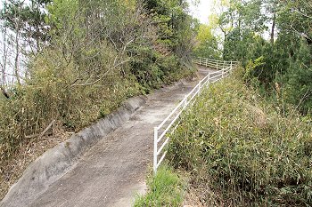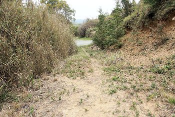 国分寺裏山古墳群の上り口に到着で、進入路を見上げますと、一応、舗装はしてあるものの実に急な坂道です。傾斜は45度くらいは有りますのかも(^-^;