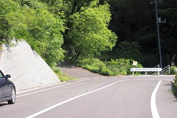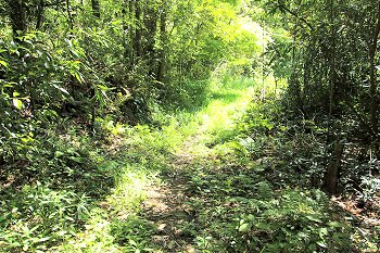 古民家を過ぎますと舗装もなくなり、雑草が生い茂りました山道に。ヘビが出て来そうで少し怖いのですけど、暫く進みますと車のタイヤ跡が…で、少し安心。