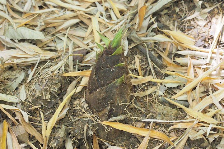 後は、来た道を逆戻りで竹林へと向かいます。笹に覆われました山道から、ニョキッと何本かタケノコが顔を覗かしておりました。