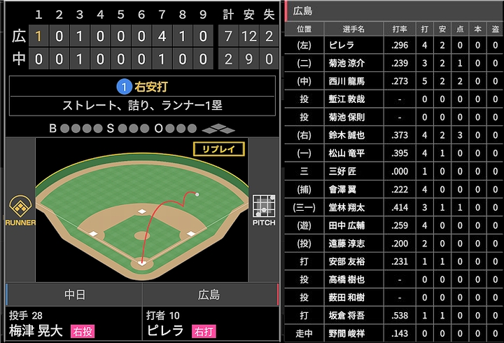 ・03回表 1番 ピレラ 二死2塁 ランナー2塁の0-1からライトへの先制タイムリーヒット! 中0-1広 1塁