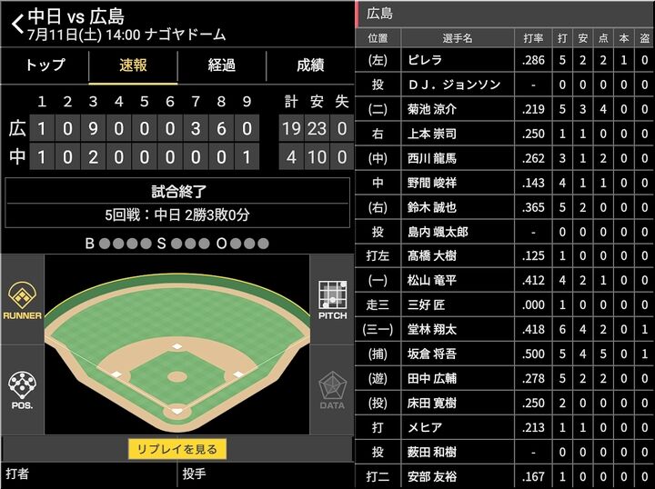 中日がサヨナラ勝ち。中日は1−2で迎えた9回裏、大島が犠飛を放ち、土壇場で試合を振り出しに戻す。そのまま迎えた延長10回には、ビシエドにソロが飛び出し、試合を決めた。投げては、4番手・R.マルティネスが今季初勝利。敗れた広島は、救援陣がリードを守れなかった。