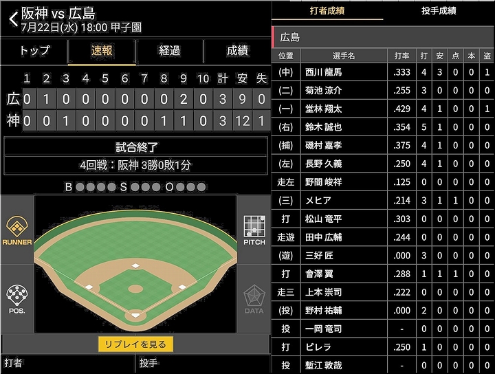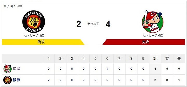 広島が逆転勝利。広島は2点ビハインドで迎えた6回表、ピレラのグランドスラムが飛び出し、試合をひっくり返す。投げては、先発・森下が6回4安打2失点の好投。その後は3人の継投で逃げ切り、森下は今季2勝目を挙げた。敗れた阪神は、打線が好機を生かしきれなかった。
