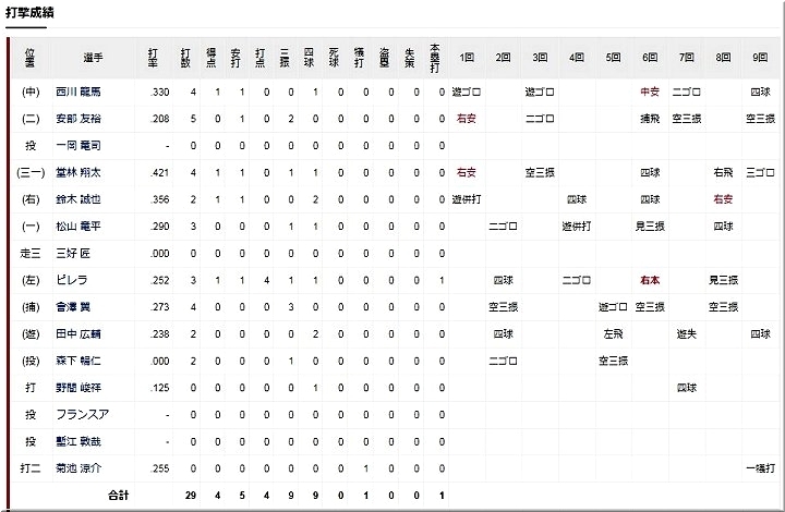 ・1回表 3番 オースティン 無死1、3塁 0アウト1、3塁の0-1からダブルプレーの間に一人ランナーがかえりDeNA1点をあげる 広0-1デ 2アウト