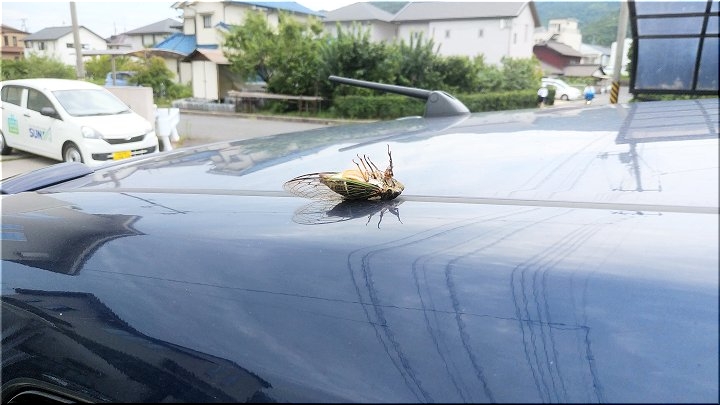 その際に、何気なく車に眼を向けますと、屋根の片隅にセミが仰向けに…