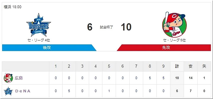 DeNAは初回、ロペスと宮崎の連続適時打で2点を先制する。その後1点差とされて迎えた8回表には、ソトの適時打とオースティンの2ランで3点を奪い、リードを広げた。投げては、先発・井納が6回1失点の好投で今季2勝目。敗れた広島は、打線が振るわなかった。