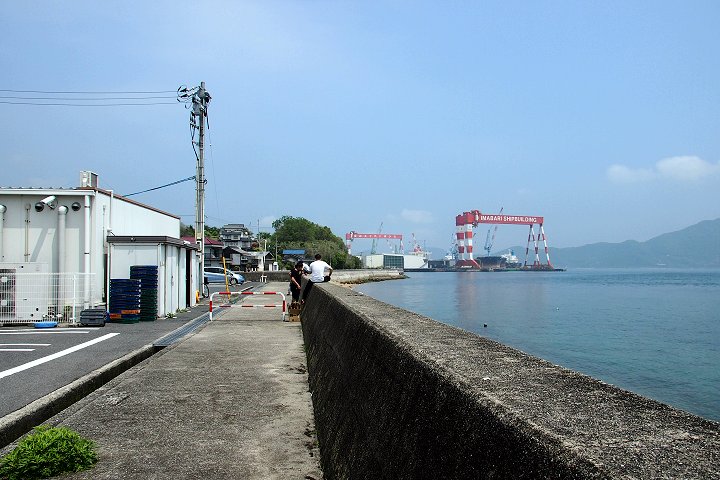 パンと牛乳を手に、堤防沿いに今治造船を眺望です。昔は、この辺りから「幸陽船渠」の社名が眼に入りましたけど、う〜ん、今では「今治造船」なんですねぇ〜