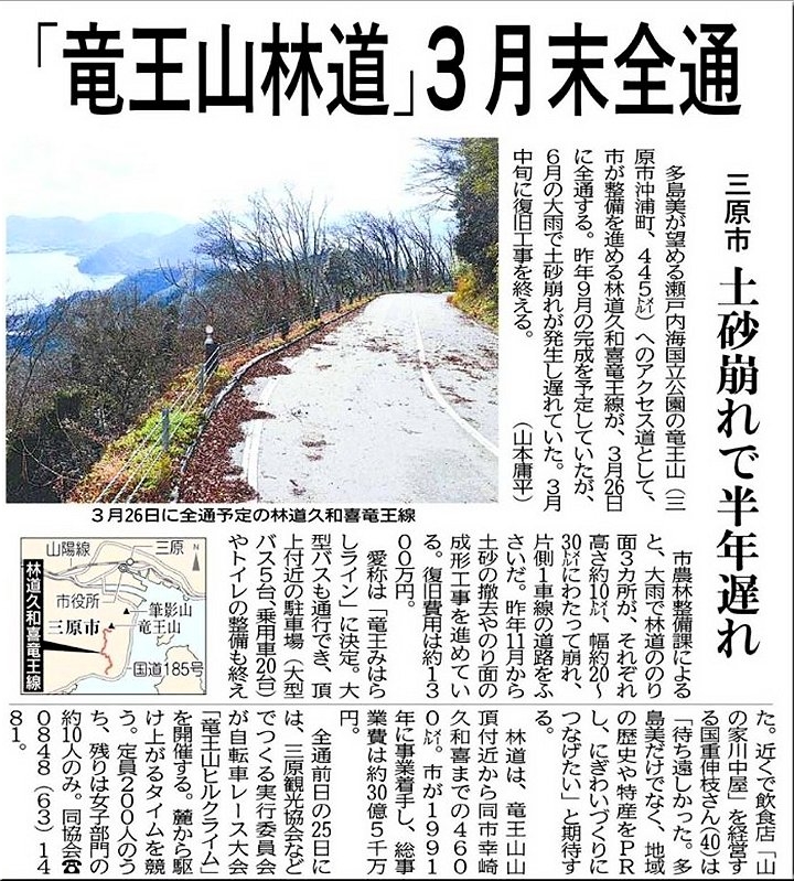 2017年3月26日、三原市幸崎町久和喜から竜王山山頂までを結ぶ総延長4.6kmの竜王みはらしライン(林道久和喜竜王線)が開通した。