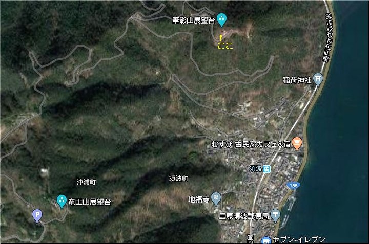広島県三原市街の南、三原湾、佐木島、しまなみ海道の島々を眼前にする筆影山(標高311m)の山頂にある展望台。狭いながらも山頂までは車道が通じていて、山頂は桜の植栽された園地になっています。ルートは北側の和田から上る和田口と南側の須波口の2本。山頂の駐車場から200mほど歩くと東屋が展望施設となった展望台があります。