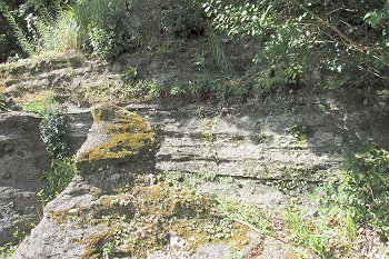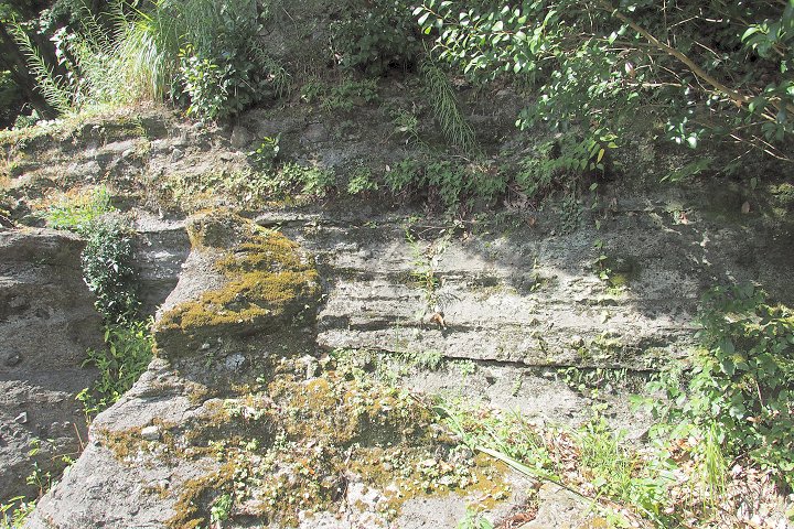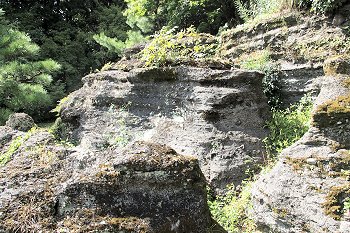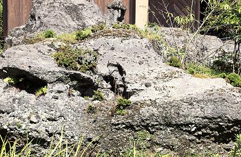 標高約260m、千手院の庭に露出した貝殻石灰岩で、岩はだが長い年月の間に地下水で溶かされ、浪に洗われた跡のように見えることから浪形岩の名称がつけられました。