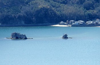 岩子島と向島の間に少ししだけ見えます赤い橋…向島大橋ですねぇ〜因島の大浜海岸沖の二つの小さな島…八重子島ですねぇ〜いずれもイィ景観です(^_^)v
