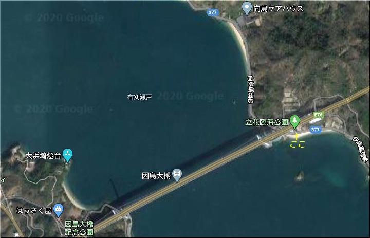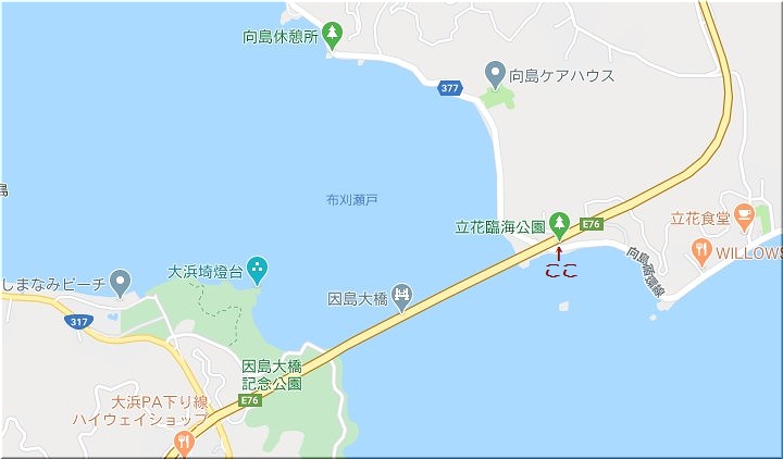 向島側の因島大橋下の立花臨海公園に到着です。ここには無料駐車場がありますので、ここに駐車。
