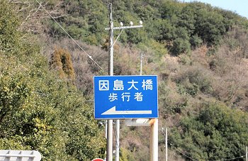 そして、早速、因島大橋を渡りますけど、駐車場からスグに「因島大橋 歩行者」の標識がありますので、この標識に従って因島大橋にと上がります。