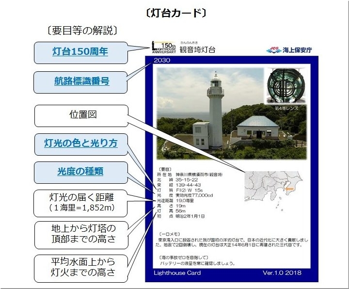灯台カードは、灯台に関する諸情報をデジタル画像としてカード化したもので、海上保安庁ホームページから電子データ(L判サイズ、pngファイル)により提供するものです。