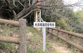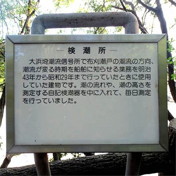 大浜埼潮流信号所で布刈瀬戸の潮流の方向、潮流が変わる時期を船舶に知らせる業務を明治43年から昭和29年まで行っていたときに使用していた建物です。潮の流れや、潮の高さを測定する自記検潮器を中に入れて、毎日測定を行っていました。