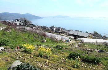 仙酔島・弁天島・鞆の町のズッと向こうには四国連山も臨めます。そして、眼下には今から訪れます菜の花畑。何人か先客もおられますようですネ(^.-)☆