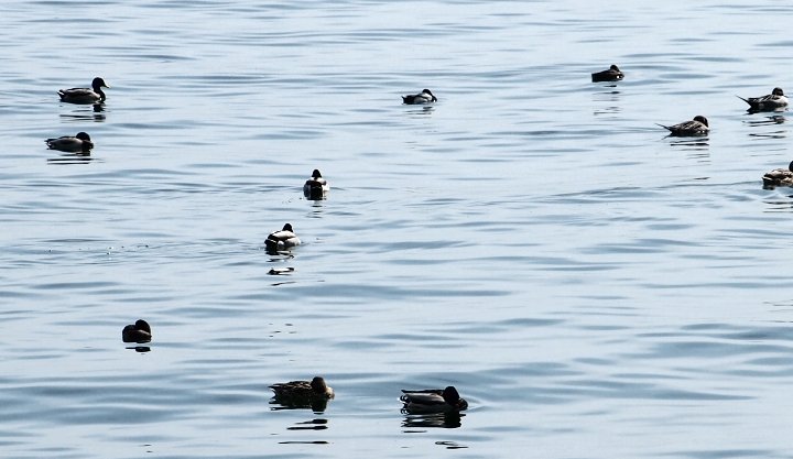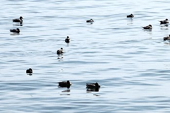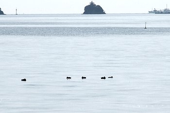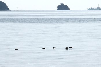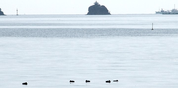 海面にはカモsan達がノンビリと浮かんでおりました。そして、その後方に仙酔島・弁天島が。