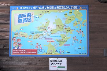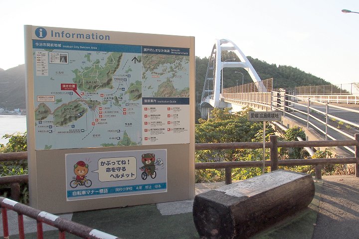 上蒲刈島 -- (豊島大橋) -- 豊島 -- (豊浜大橋) -- 大崎下島 -- (平羅橋) -- 平羅島 --(中の瀬戸大橋) -- 中ノ島 -- (岡村大橋) -- 岡村島 と走行し、岡村島の最東端にと到着です。