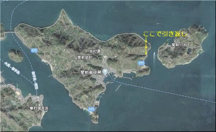 このまま岡村島を一周し岡村大橋まで戻ろうとしますけど、最東端から先の道は狭そうで、車一台がヤッと走行可能な状況なのかも分かりません。