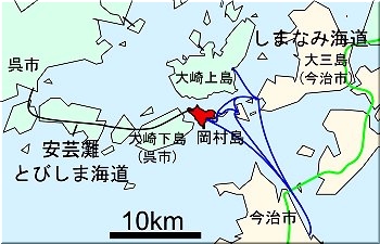岡村島は、日本本土(北海道・本州・四国・九州・沖縄本島)と橋で繋がっている島の中では熊本県の樋島・下須島・通詞島(ともに7橋)と並んで一番橋を渡る回数が多い(しまなみ海道を除く)。さらに、所属する県庁までの通過架橋を比較すると17橋という桁違いの橋数を誇る。