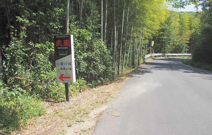 白簾の滝の岩は赤っぽい。HP『岡山の滝見リスト』では、とてもいい滝に見えたんだが…水量ですね。中国道周辺の滝水量は充分だったのですが…滝見道を戻ると、駐車した場所より110m程上手に出た。「武蔵ロケ地」と書かれた立派な看板がありました。この付近の道端にも駐車出来そうです。