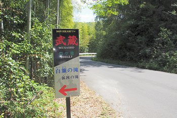兎に角、滝の場所が判らずに周辺をウロウロする。住民に滝の場所を聞いても知らないと言う。何度か聞いている内に滝の場所を知っている人が居た。ダムの下に戻って宇戸方面に道路を真っ直ぐ行くと教えてくれたが、宇戸方面への道標が無く、何か違うことが書いてあった。真っ直ぐの言葉通りに脇道に入ると大河ドラマのロケ地であった大きな看板が立っていた。こんな看板は道路の曲がり角に立てて欲しかった。