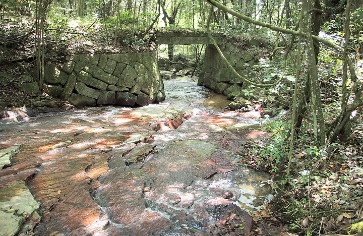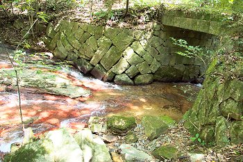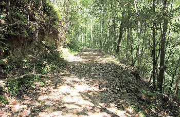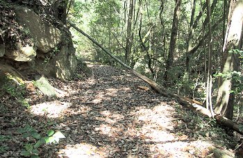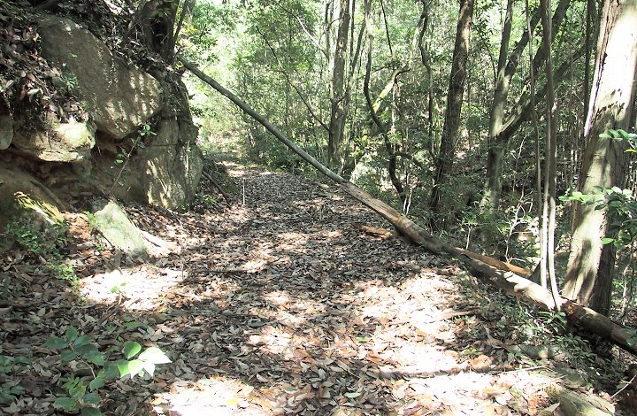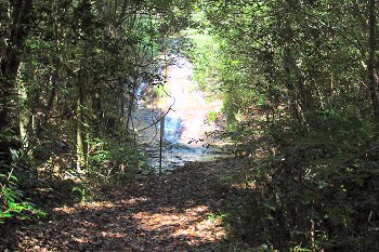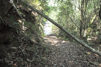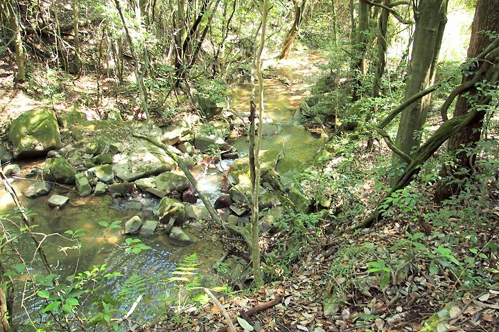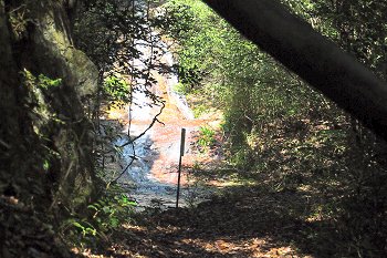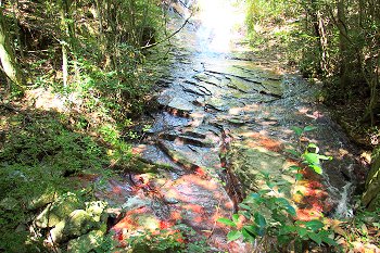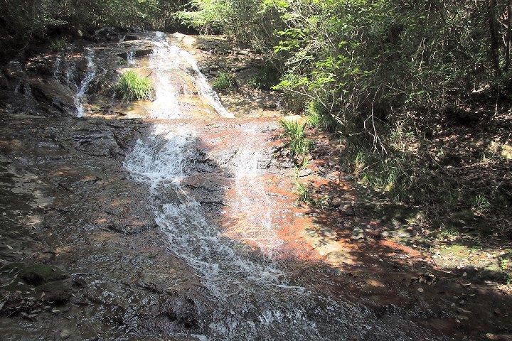 田圃のあぜ道を進む…少し不安…数分で堰堤に突き当たってしまう。堰堤手前に左上への踏み跡があり、その道を登ると立派な横道に出た。どうやらこちらが本来のルートのようだ。事前調査が不足していました。数分で滝が見えてきた。水の少ないナメ滝だ。左にも小さな滝が落ちている。狐渡(こと)の滝でしょう。