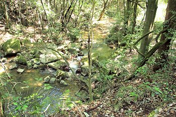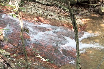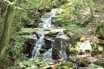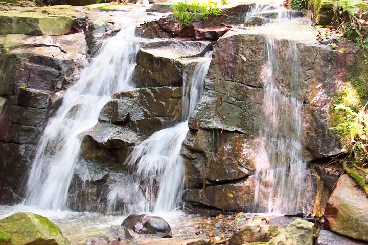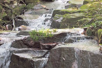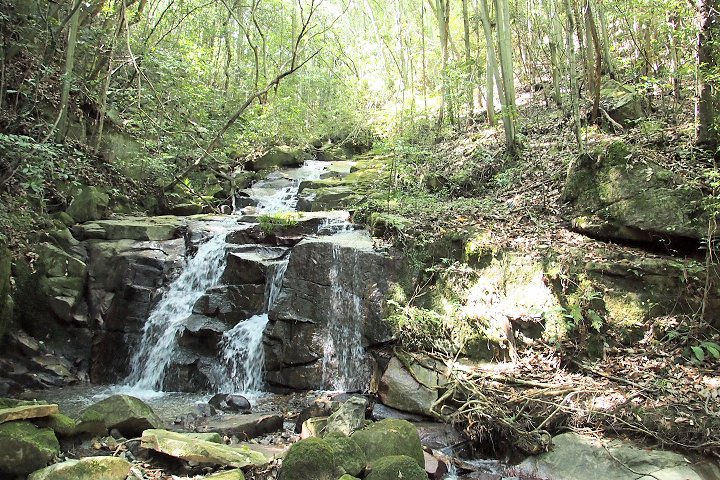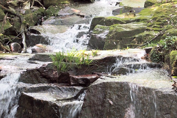 せせらぎの中で流れる滝。「落ちる」というよりも「流れる」という印象が強い穏やかな滝。周囲は木々に囲まれ、せせらぎがよく聞こえるほど静かな自然の中にある。
