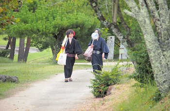 「城主の館」を後にし、「三斎市」の方に戻っていますと、前方から着物姿の若者がお二人…