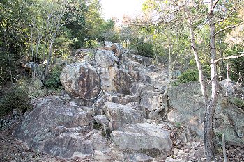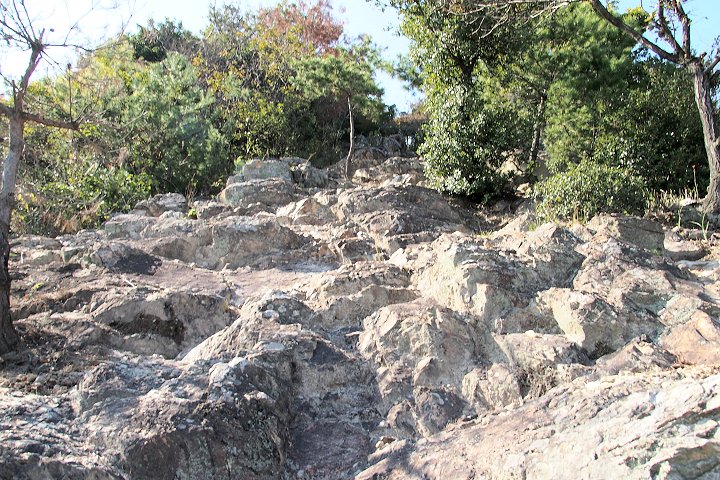 石鎚神社で手を合わせまして、また、頂上に向かって前進です。が、石鎚神社の上方には、立ちはだかるほどではありませんけど、ボコボコとしました岩肌が(^.-)☆