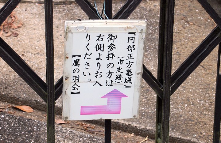 阿部正弘公は老中在職中に亡くなられました。亡くなられたのは39歳の時です。非常に若いですね。正弘公のお墓は東京都台東区谷中7丁目にある都立の霊園、谷中霊園の中に存在しているそうです。