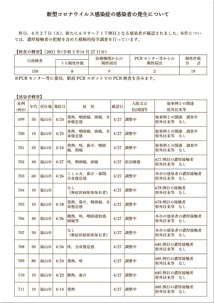 4/27(火)、699〜717例目となる19人の感染者が確認されました。詳細は画像のとおりです。大型連休は感染拡大地域など県をまたぐ移動を控え、不要不急の外出は自粛しましょう。