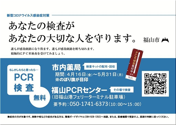 3.症状がない場合でも、心当たりの方は、積極的にPCR検査を受検してください(福山PCRセンター、福山駅前臨時PCRスポット、市内薬局の検査は無料です)。