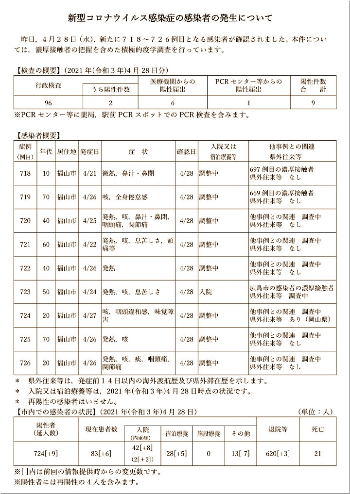 4/28(水)、718〜726例目となる9人の感染者が確認されました。詳細は画像のとおりです。