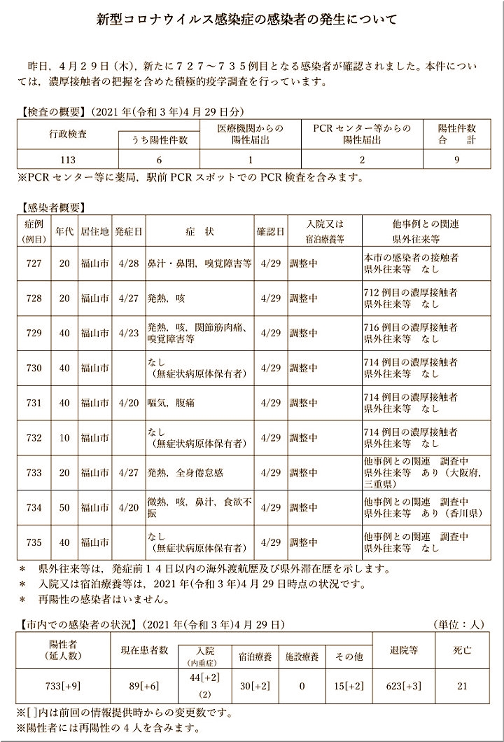 4月29日(木)、727〜735例目となる9人の感染者が確認されました。詳細は画像のとおりです。