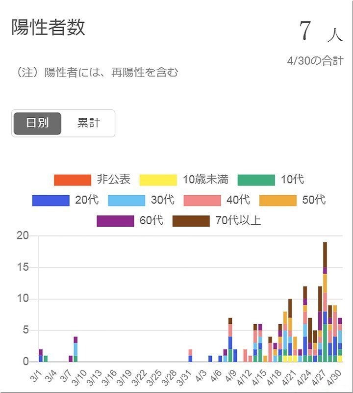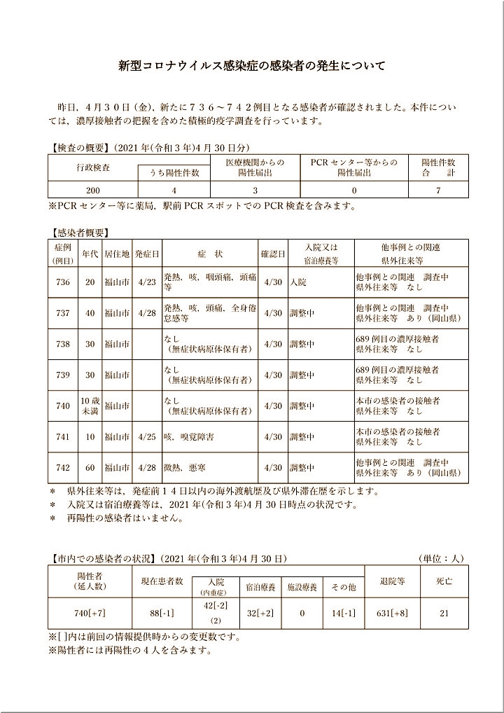 4月30日(金)、736〜742例目となる7人の感染者が確認されました。詳細は画像のとおりです。