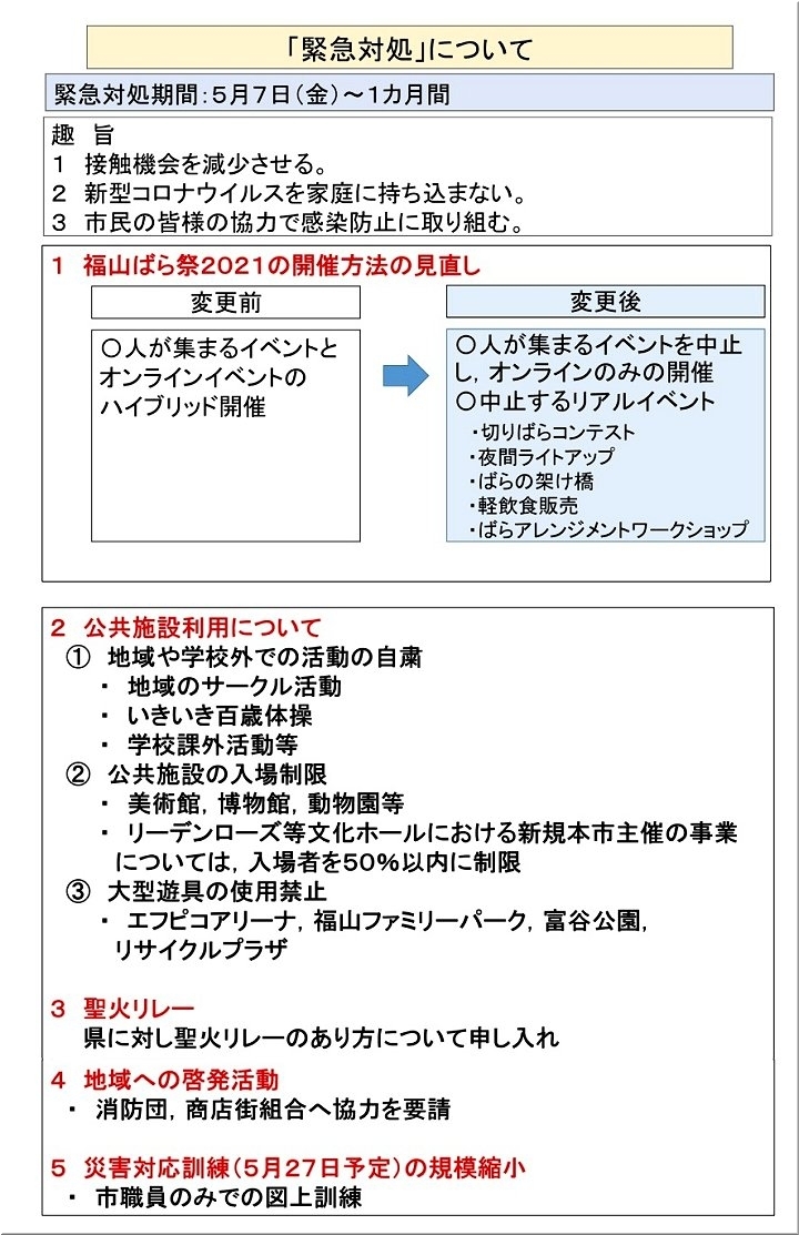 …と、こんな福山市の状況ですから、現在の取り組みの『4/29〜5/16までの「取組集中期間」』を、『本日・5/7(金)から1カ月間を新たに「緊急対処期間」』として、集中的に取り組まれるようであります。
