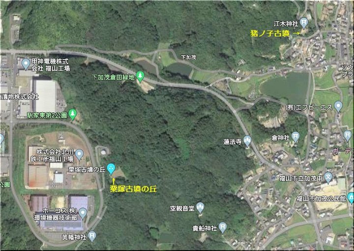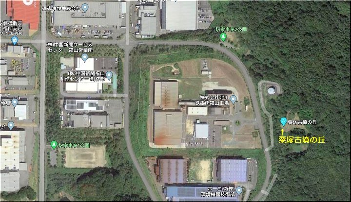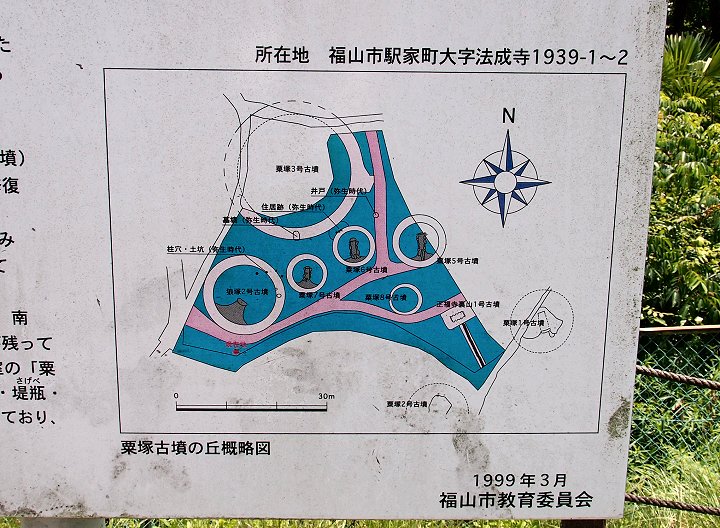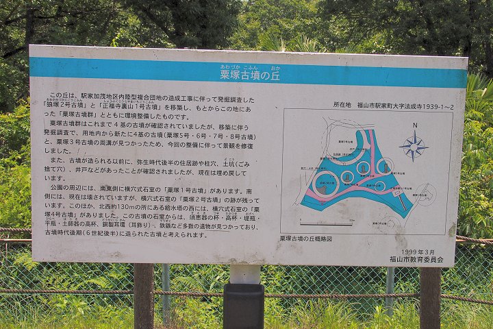 福山北産業団地東端にある古墳群で8基中6基が現存しています。団地造成に伴い発掘が行われ5基が粟塚古墳の丘公園として復元保存されています。古墳のすぐ側まで車で行けますが駐車スペースが狭いので前の道路に止めて歩いて行った方がいいかも(すぐ前の工業団地区画は工場が全く進出していない)。