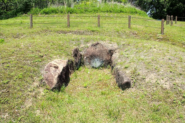 最大の3号墳は周溝や墳丘の一部が発掘されただけで本体はそのまま保存、粘土槨があるそうだ。周溝にも突出部がありますが現状ではその表示はない。周辺の5、6、7、8号は石室基部だけ残っていて周溝や墳丘の一部を復元して展示されています。説明板を見て緑色の部分が保存されていて最大の3号墳は殆ど削平かと思ったが見てみると全くそんなことはない。よく見たら緑色の部分は発掘場所でした。
