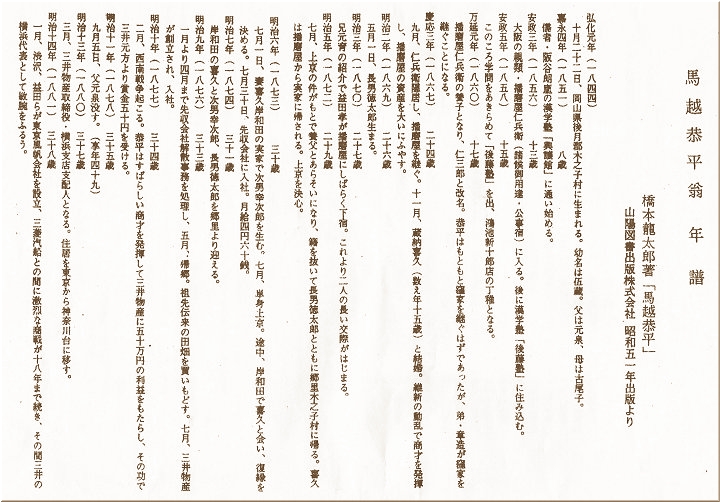 馬越恭平は、1844年に岡山県、現在の井原市木之子町に生まれました。家は代々医師の家系だったそうです。12歳で大阪へ丁稚に出て、その後、三井物産の社員として手腕を発揮しました。